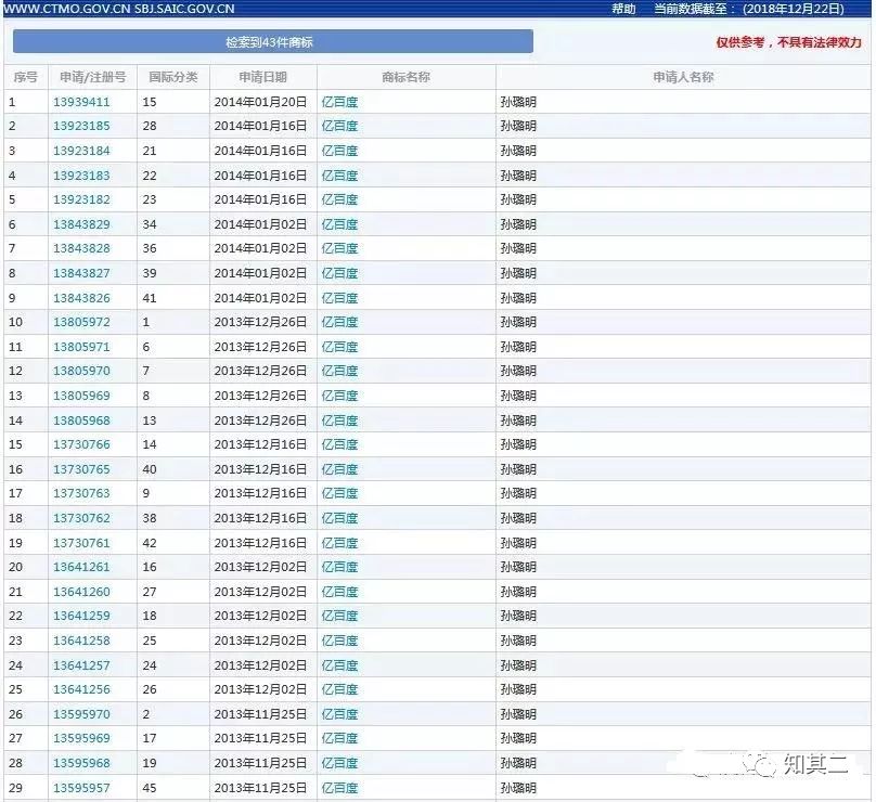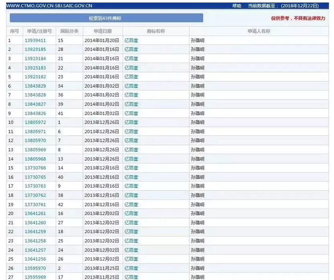 根據(jù)中國商標(biāo)網(wǎng)數(shù)據(jù),深圳億百度公司法定代表人孫璐明共申請(qǐng)注冊(cè)了43件“億百度”商標(biāo)。其中,第12515701號(hào)43類“億百度”商標(biāo)于2006年04月27日,并于2009年10月14日獲準(zhǔn)注冊(cè)。