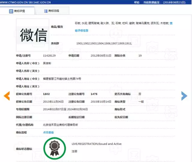 2011年1月21日微信1.0測試版發(fā)布,直到2011年1月24日,也就是三天后,騰訊才正式向商標(biāo)局提交了“微信”圖文商標(biāo)注冊申請,并且僅涉及兩個類別,即計算機相關(guān)(9類)和電視相關(guān)(38類)。