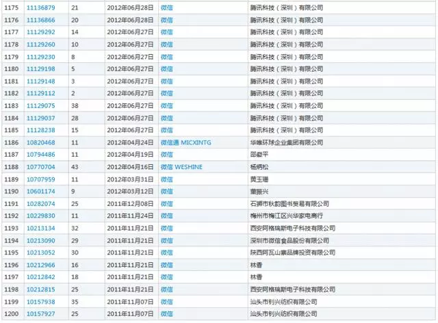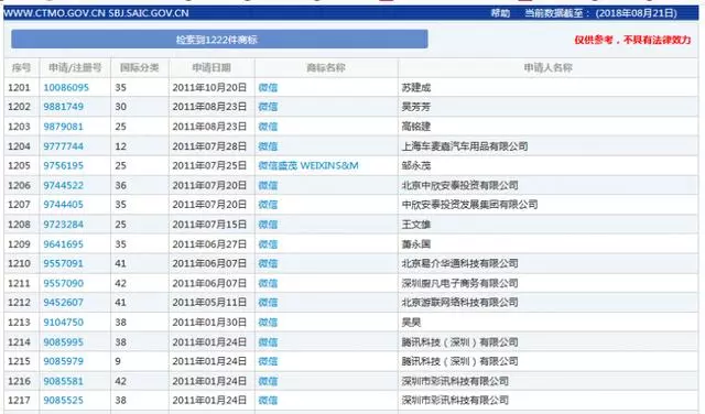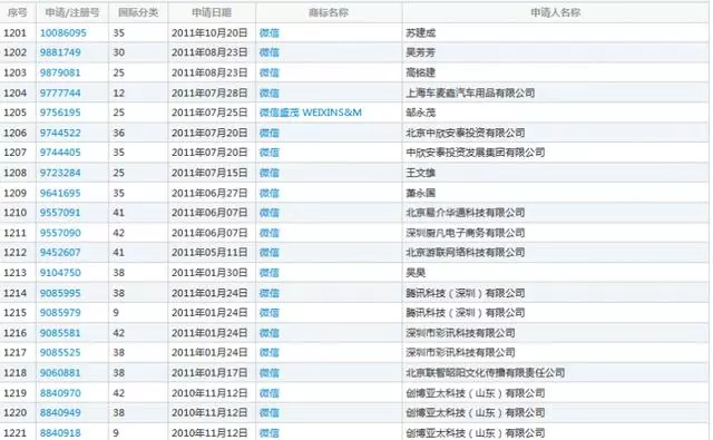 由于當(dāng)初沒有選擇一口氣45類全類別注冊“微信”商標(biāo),待騰訊公司反應(yīng)過來時,多家企業(yè)及個人已經(jīng)搶先注冊了多個類別的“微信”商標(biāo)。