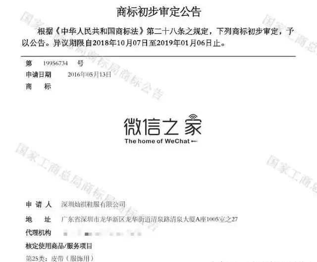 就在最近的一批商標(biāo)初審公告里,就出現(xiàn)了這樣一個商標(biāo),“微信之家The home of WeChat”,核定使用商品為第25類,皮帶(服飾用)。