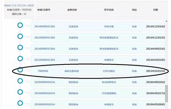 我們把整個流程往前翻,赫然發(fā)現(xiàn)在2012年2月15日特種兵商標(biāo)確實是注冊下來了。