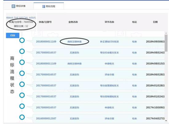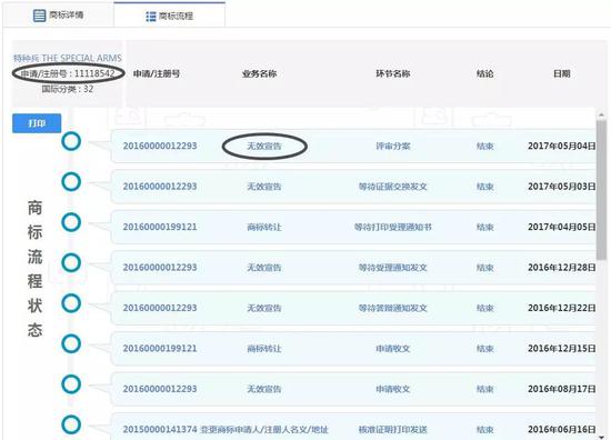 但凡能打印出注冊證的,就是商標(biāo)已經(jīng)注冊??稍?014年4月10日特種兵的商標(biāo)就被宣告無效。