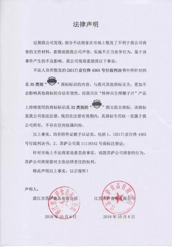 原本,此事的“結(jié)局”也沒掀起多大波瀾,只有一家自媒體報道了這個終審??商K薩食品卻坐不住了,認(rèn)為這是有企業(yè)、不法商家在黑他們。所以,在國慶假期還沒結(jié)束,就發(fā)了一條法律聲明,并蓋上了公司的章。