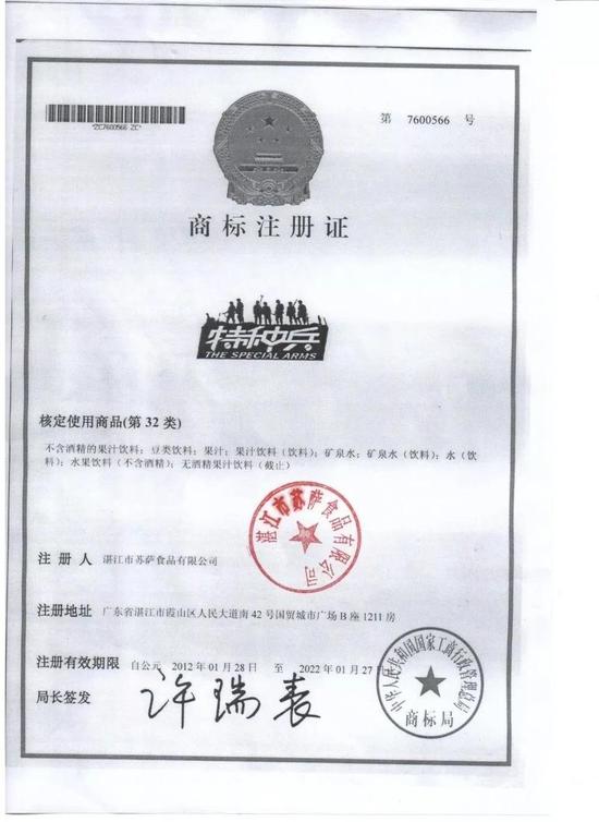 第7600566號、第11118542號商標(biāo)注冊證,證明了蘇薩食品分別于2012年1月28日、2014年7月21日獲得了以“特種兵”為顯著標(biāo)識部分的注冊商標(biāo),核定使用商品均為第32類,蘇薩食品依法享有注冊商標(biāo)專用權(quán)。