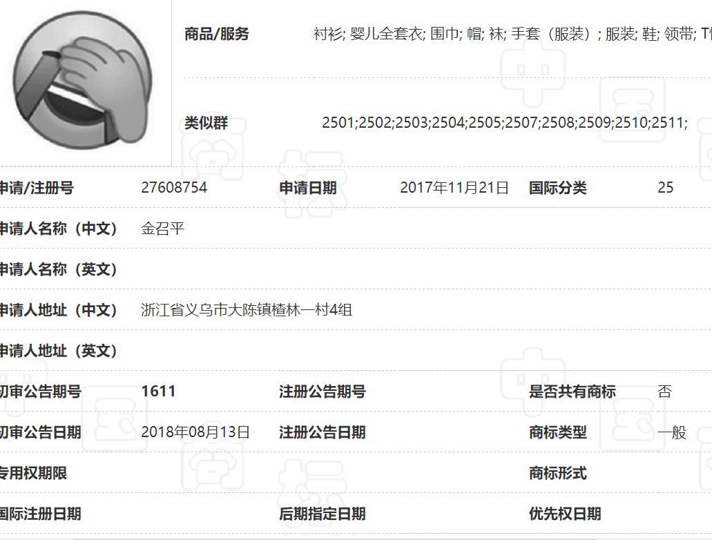 申請類別為25類。資料顯示,第25類商標主要以服裝,鞋,帽為主,包括服裝商標、內衣商標、鞋商標等。8月13日,“捂臉”表情通過初審。