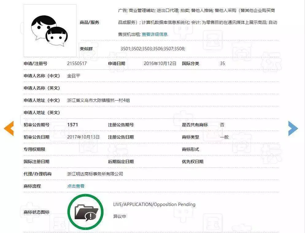 中國商標網顯示,搶注“捂臉”表情的人是金召平,他早在2017年11月21日就搶注了新晉小黃臉網紅“捂臉笑”,由浙江明達商標事務所有限公司代辦理。