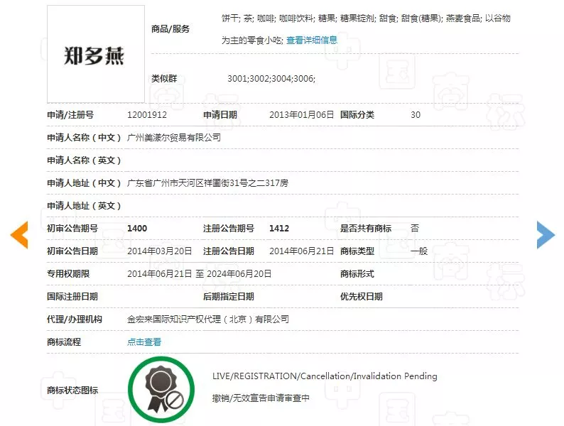2013年1月,廣州美漾爾貿易有限公司向國家工商行政管理總局商標局申請注冊了“鄭多燕”商標,并于2014年6月注冊成功,核定使用在“咖啡、茶、糖果及餅干”等商品上。