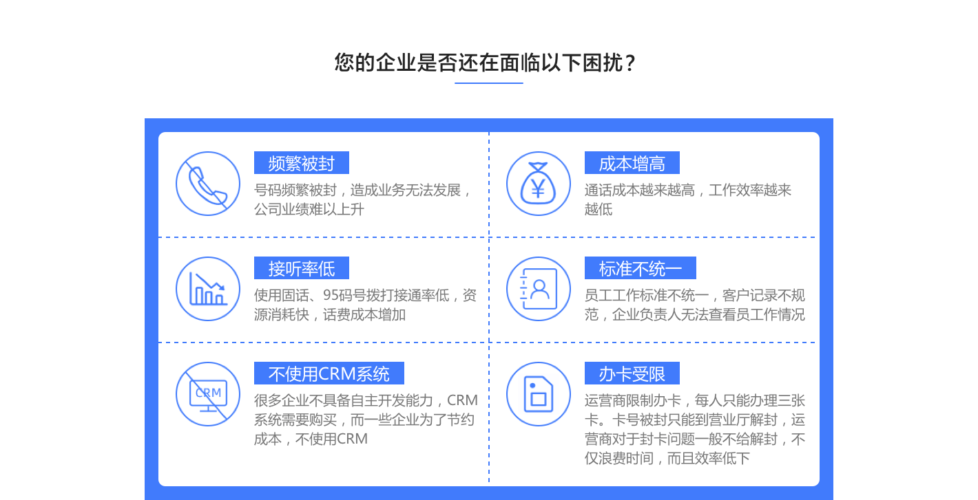 防封電銷卡是專門用于撥打電話銷售電話的手機卡.它的主要特點是很難阻止.因此,它是電話推銷員的上佳選擇.當(dāng)然有些人在購買電話推銷卡時會產(chǎn)生誤解.他們認(rèn)為,防封電銷卡將永遠(yuǎn)不會被封鎖.這種理解顯然是錯誤的.防封電銷卡并不是真正的卡,也永遠(yuǎn)不會被屏蔽.只要您所在的行業(yè)正常且合法,就不會輕易在常規(guī)的高頻輸出中被封號,但是如果您在使用它們時收到客戶的投訴,也會出現(xiàn)被封號的風(fēng)險.接下來小編來講解一下購買和使用防封電銷卡的注意須知.