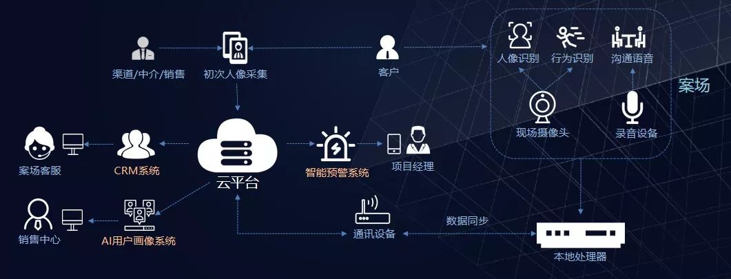 通過案場安裝監(jiān)控攝像頭,利用事前的渠道登記信息,客戶到達現(xiàn)場后,依靠人臉識別技術(shù),準(zhǔn)確判斷客戶身份信息,匹配真實的渠道來源和跟進服務(wù)措施,從而給予正確的獎勵方式和金額。通過肢體行為、表情、語言等信息,結(jié)合AI技術(shù),實現(xiàn)準(zhǔn)確的客戶畫像,從而進行客戶購買意向的準(zhǔn)確判定。