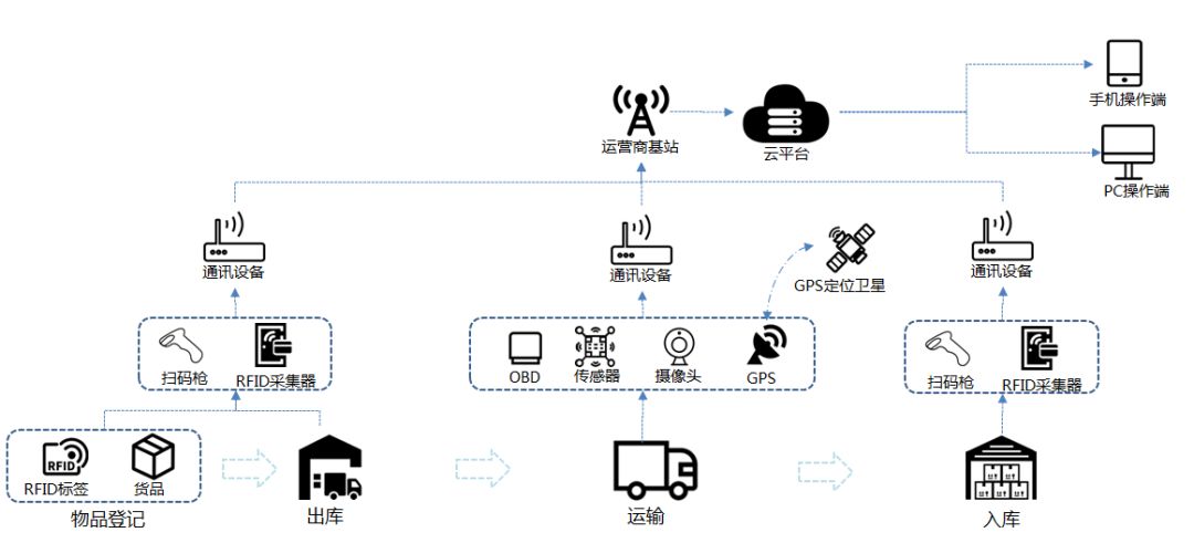 利用RFID技術,在倉庫和運輸車輛上安裝RFID數(shù)據采集感應設備,通過對貨物的RFID標簽化,實現(xiàn)貨物的自動感知,達到倉庫自動進出庫盤點功能。在運輸過程中,針對貨物車輛安裝定位設備,貨物包裝內部安裝震動,溫度,濕度,光感等傳感器,偵測貨物的狀態(tài)信息,拆封信息,及時上報數(shù)據到云平臺,通過本方案,實現(xiàn)貨物從出入庫到運輸過程的全程管控,提高物流企業(yè)信息化水平,服務水平,增強企業(yè)競爭力。